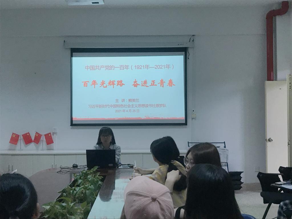 黨史學(xué)習(xí)教育基礎(chǔ)在學(xué)習(xí)、目的在教育,將黨史學(xué)習(xí)教育融于立德樹(shù)人全過(guò)程。習(xí)近平新時(shí)代中國(guó)特色社會(huì)主義思想讀書(shū)社原夢(mèng)隊(duì)同學(xué)于2021年4月25日齊聚馬院社團(tuán)研討室,由熊美蘭老師作題為“百年光輝路奮進(jìn)正青春”的專(zhuān)題宣講,引導(dǎo)同學(xué)從百年黨史中汲取智慧和力量,爭(zhēng)做新時(shí)代的奮斗者。