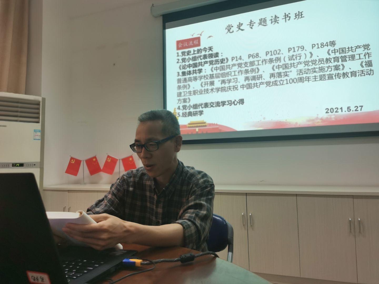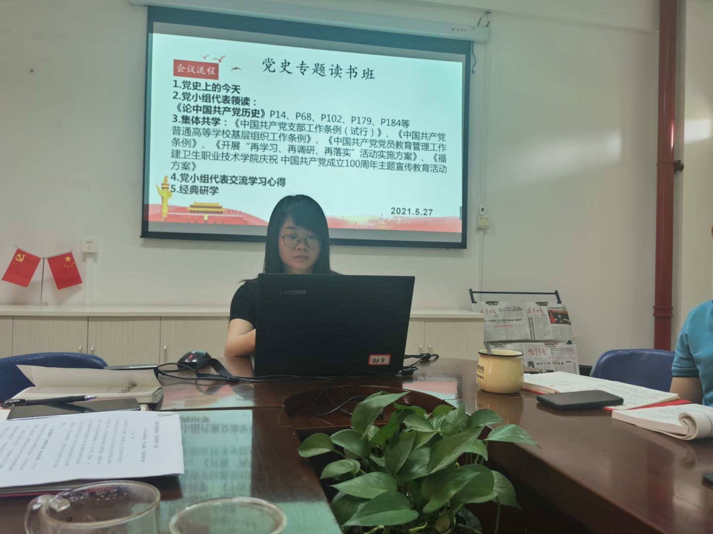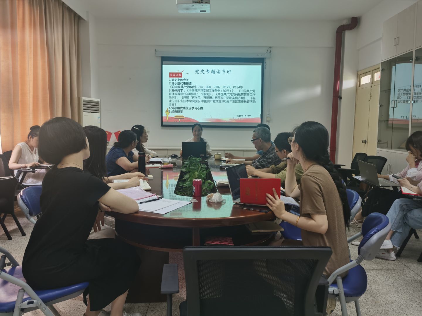 為深入學(xué)習(xí)黨史,傳承紅色基因,擔(dān)當(dāng)初心使命,2021年5月27日直屬馬克思主義學(xué)院黨支部第二黨小組在會(huì)議室107進(jìn)行黨史學(xué)習(xí)。學(xué)習(xí)活動(dòng)由黨小組組長來朋珍主持。