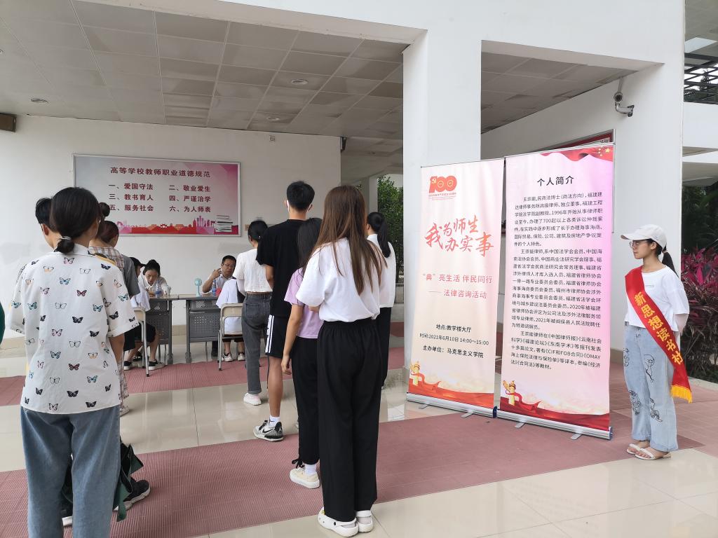 本次活動(dòng)特別邀請(qǐng)了福建工程學(xué)院法學(xué)院副教授王崇能,現(xiàn)場(chǎng)提供法律咨詢服務(wù),為我校師生答疑解惑。王崇能副教授,福建建達(dá)律師事務(wù)所高級(jí)律師,自1996年從事律師職業(yè)至今,辦理了700起以上各類訴訟仲裁案件,擅長(zhǎng)海事海商、國(guó)際貿(mào)易、保險(xiǎn)等領(lǐng)域的民事爭(zhēng)議案件。