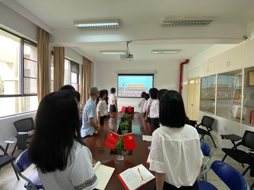 直播中,隨著國(guó)歌奏響,國(guó)旗緩緩上升,全體黨員教師面對(duì)屏幕上冉冉升起的五星紅旗行注目禮。