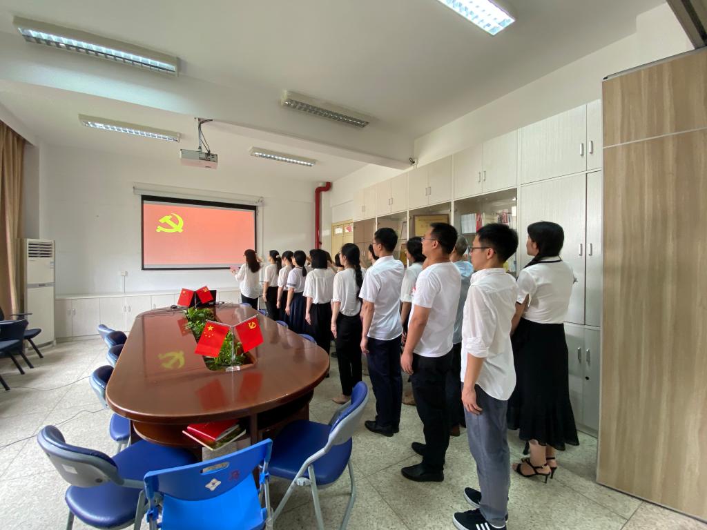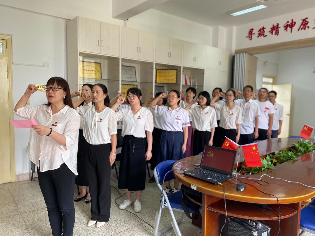 直播結(jié)束后,在莊嚴(yán)的《國(guó)際歌》聲中,全體教師黨員矗立在黨旗前,在熊美蘭同志的帶領(lǐng)下重溫入黨誓詞。