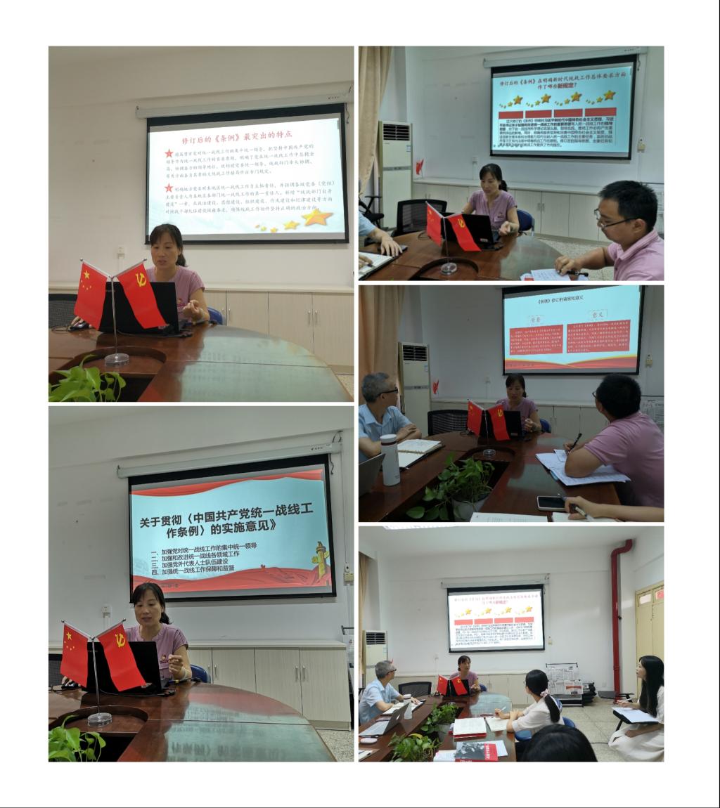 會(huì)上,黨支部開展了《中國共產(chǎn)黨統(tǒng)一戰(zhàn)線工作條例》專題講座,由直屬馬克思主義學(xué)院黨支部副書記來朋珍主講。她從《條例》的背景、意義、新時(shí)代具體要求和最突出的特點(diǎn)等方面進(jìn)行解讀。全體黨員同志還進(jìn)一步學(xué)習(xí)了《關(guān)于貫徹〈中國共產(chǎn)黨統(tǒng)一戰(zhàn)線工作條例〉的實(shí)施意見》。