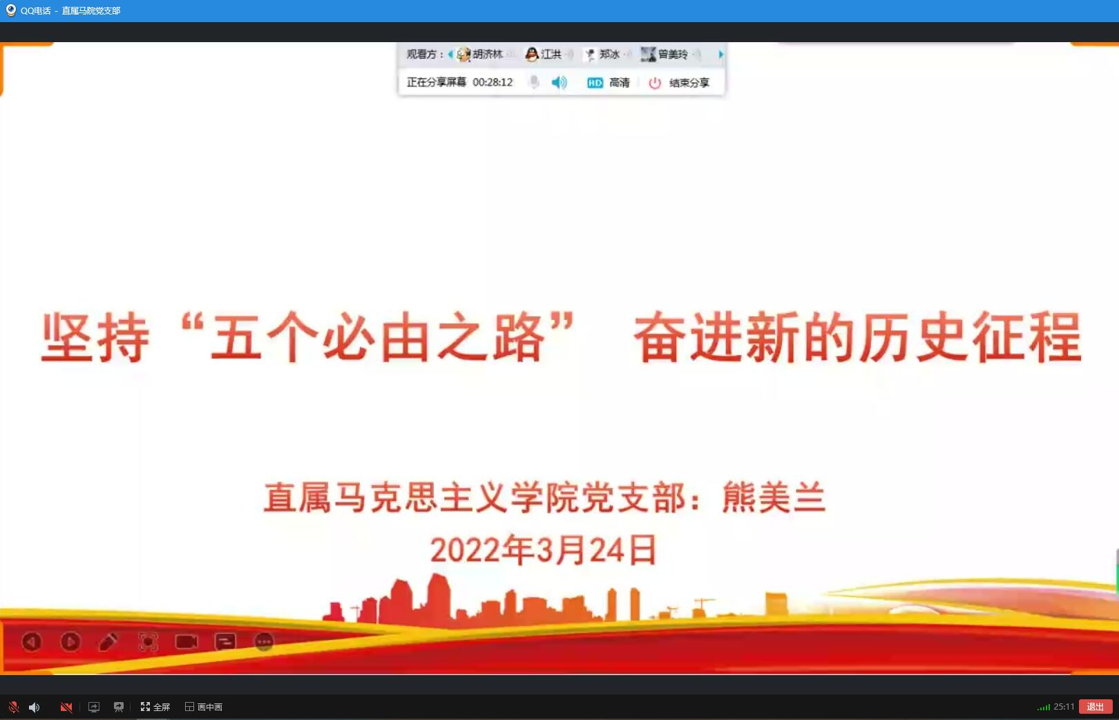 為了更好地學(xué)習(xí)宣傳貫徹兩會(huì)精神,2022年3月24日上午,直屬馬克思主義學(xué)院黨支部熊美蘭書記通過QQ群平臺(tái)線上為黨支部作了題為“堅(jiān)持‘五個(gè)必由之路’ 奮進(jìn)新的歷史征程”黨課。支部全體黨員同志參加學(xué)習(xí)。