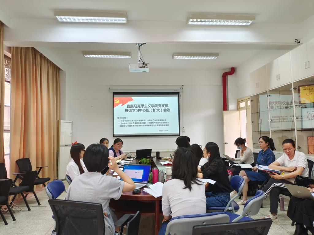2022年4月14日上午,直屬馬克思主義學(xué)院黨支部在107會(huì)議室召開中心組學(xué)習(xí)(擴(kuò)大)會(huì)議,學(xué)習(xí)《習(xí)近平總書記關(guān)于堅(jiān)持自我革命、全面從嚴(yán)治黨的重要論述》《中國(guó)共產(chǎn)黨黨內(nèi)重要法規(guī)匯編》《中國(guó)共產(chǎn)黨黨內(nèi)法規(guī)體系》《教育部公開曝光第九批7起違反教師職業(yè)行為十項(xiàng)準(zhǔn)則典型案例》《打“虎”不歇,防疫不力被問責(zé)》等內(nèi)容。本次會(huì)議由直屬馬克思主義學(xué)院黨支部副書記來朋珍主持。