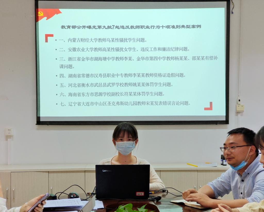 徐舒寧同志分享了《教育部公開曝光第九批7起違反教師職業(yè)行為十項(xiàng)準(zhǔn)則典型案例》的心得體會(huì)。她強(qiáng)調(diào),作為一名高校思政課教師,必須自覺地加強(qiáng)自身的職業(yè)道德修養(yǎng),既要以學(xué)問教人,又要以道德范人。尤其是應(yīng)不斷加強(qiáng)自身的學(xué)術(shù)道德修養(yǎng),做到自覺、自醒、自強(qiáng)、自重、自律,從而提高自己樹立良好師德師風(fēng)的自覺性,以自己高尚的品德塑造廣大青年學(xué)生的人格和品質(zhì)。