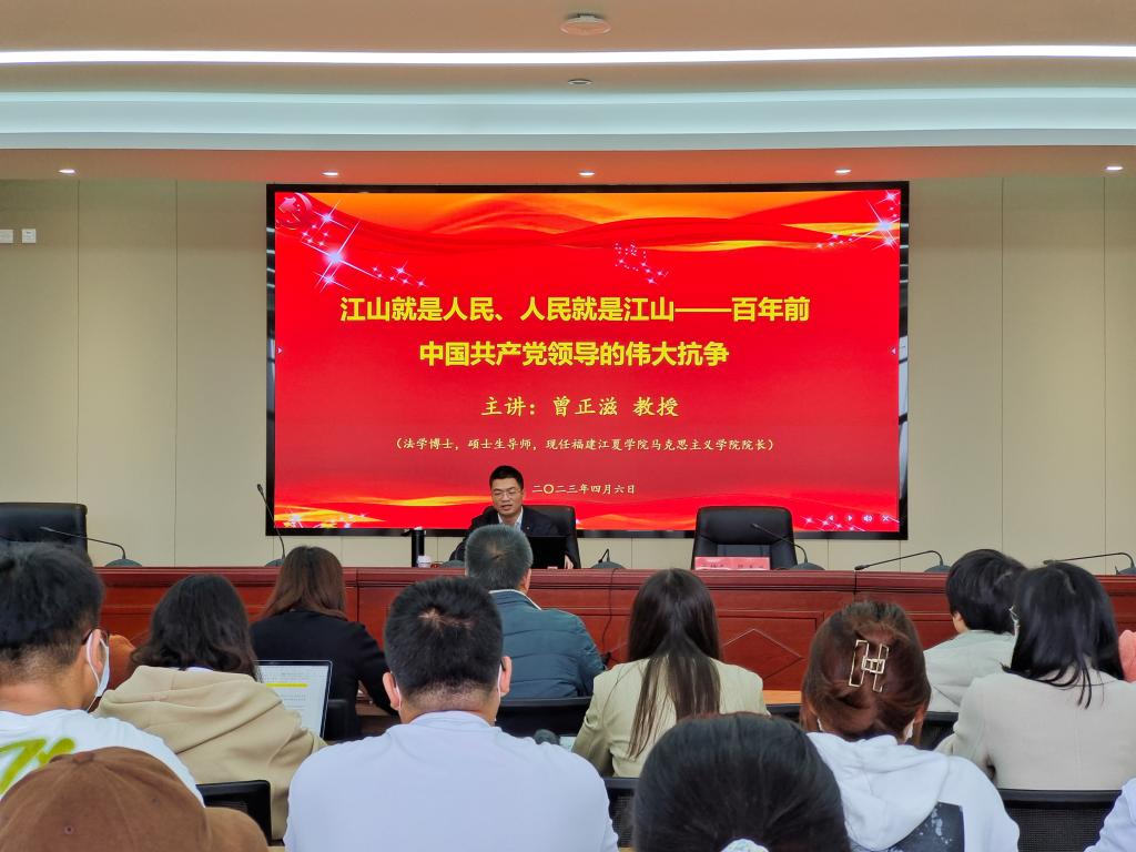 為幫助我校師生堅(jiān)持不懈用習(xí)近平新時(shí)代中國(guó)特色社會(huì)主義思想和黨的二十大精神凝心鑄魂,進(jìn)一步學(xué)習(xí)黨的百年奮斗重大成就和歷史經(jīng)驗(yàn),落實(shí)省委“深學(xué)爭(zhēng)優(yōu)、敢為爭(zhēng)先、實(shí)干爭(zhēng)效”行動(dòng)部署,2023年4月6日,我校邀請(qǐng)福建江夏學(xué)院馬克思主義學(xué)院院長(zhǎng)曾正滋教授在行政樓六樓會(huì)議室作題為《江山就是人民、人民就是江山——百年前中國(guó)共產(chǎn)黨領(lǐng)導(dǎo)的偉大抗?fàn)帯穼n}講座。中層干部代表、思政課教師、“青馬工程”學(xué)員及習(xí)近平新時(shí)代中國(guó)特色社會(huì)主義思想讀書社學(xué)生參加講座,講座由馬克思主義學(xué)院院長(zhǎng)熊美蘭主持。