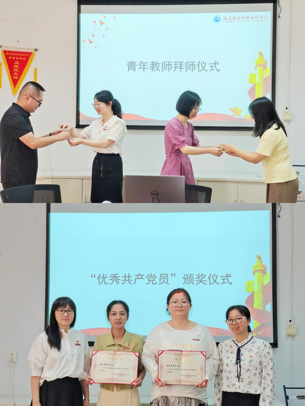 結(jié)合本次主題黨日活動(dòng)主題,直屬馬克思主義學(xué)院黨支部開(kāi)展了慶祝第39個(gè)教師節(jié)活動(dòng),全體黨員教師在黨支部書(shū)記熊美蘭的帶領(lǐng)下,共同立下錚錚誓言,牢記習(xí)近平總書(shū)記殷殷囑托,牢牢扛起光榮使命。為充分發(fā)揮優(yōu)秀骨干教師對(duì)青年教師的傳、幫、帶作用,使青年教師盡快成長(zhǎng),馬院舉行青年教師拜師儀式,鄒亞彤、劉宗永兩位新進(jìn)教師分別向?qū)焸兙床?、拜師。黨支部書(shū)記熊美蘭、副書(shū)記賴文金分別為獲得2023年“優(yōu)秀共產(chǎn)黨員”的張茵珠、曾美玲兩位同志頒獎(jiǎng),希望受到表彰的同志珍惜榮譽(yù)、發(fā)揚(yáng)成績(jī),爭(zhēng)取更大光榮。榮獲“三育人先進(jìn)工作者”的張茵珠老師作了交流分享,她表示在今后的工作中會(huì)更加積極配合,少點(diǎn)借口、計(jì)較,多點(diǎn)認(rèn)真、用心,力爭(zhēng)取得更好地成績(jī)。