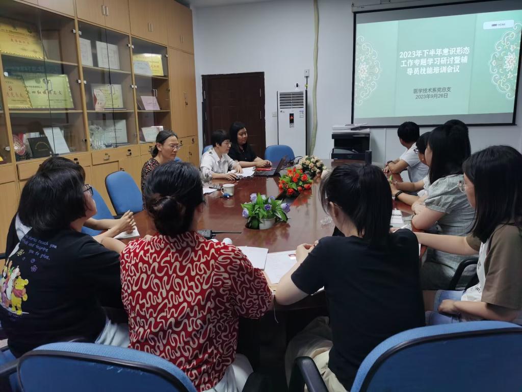 9月26日,醫(yī)學技術系召開2023年下半年意識形態(tài)工作專題學習研討暨輔導員技能培訓會議。醫(yī)學技術系黨總支書記柯瓊鶯主持會議,黨總支班子成員、輔導員參加會議。