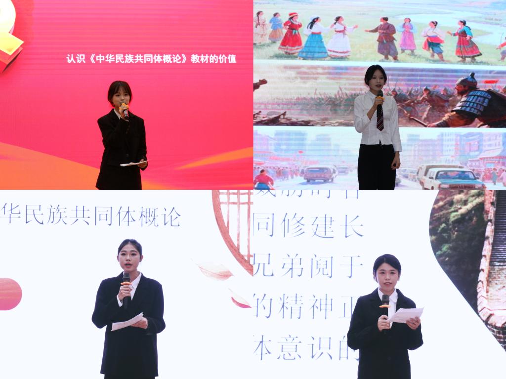 比賽現(xiàn)場(chǎng),15名選手依托《中華民族共同體概論》教材,結(jié)合自身的學(xué)習(xí)、生活實(shí)踐,從不同維度深刻闡釋了對(duì)中華民族共同體意識(shí)的深刻認(rèn)知。他們或以激昂澎湃之態(tài),縱論各民族在歷史長河中披荊斬棘、攜手共進(jìn)的壯闊征程,從“昭君出塞”的民族和親佳話,到“土爾扈特萬里東歸”的愛國壯舉,再到抗日戰(zhàn)爭(zhēng)時(shí)期各族兒女同仇敵愾、共御外侮的英勇事跡,生動(dòng)展現(xiàn)中華民族強(qiáng)大的凝聚力和向心力;或以溫情細(xì)膩之筆,講述身邊平凡而感人的民族團(tuán)結(jié)故事,社區(qū)里各族居民互幫互助的溫馨場(chǎng)景、校園中不同民族同學(xué)攜手共進(jìn)的青春身影,傳遞出民族團(tuán)結(jié)一家親的深厚情誼,充分彰顯新時(shí)代青年勇?lián)姑⑹钢緢?bào)國的堅(jiān)定決心,引發(fā)了在場(chǎng)師生的深刻共鳴。