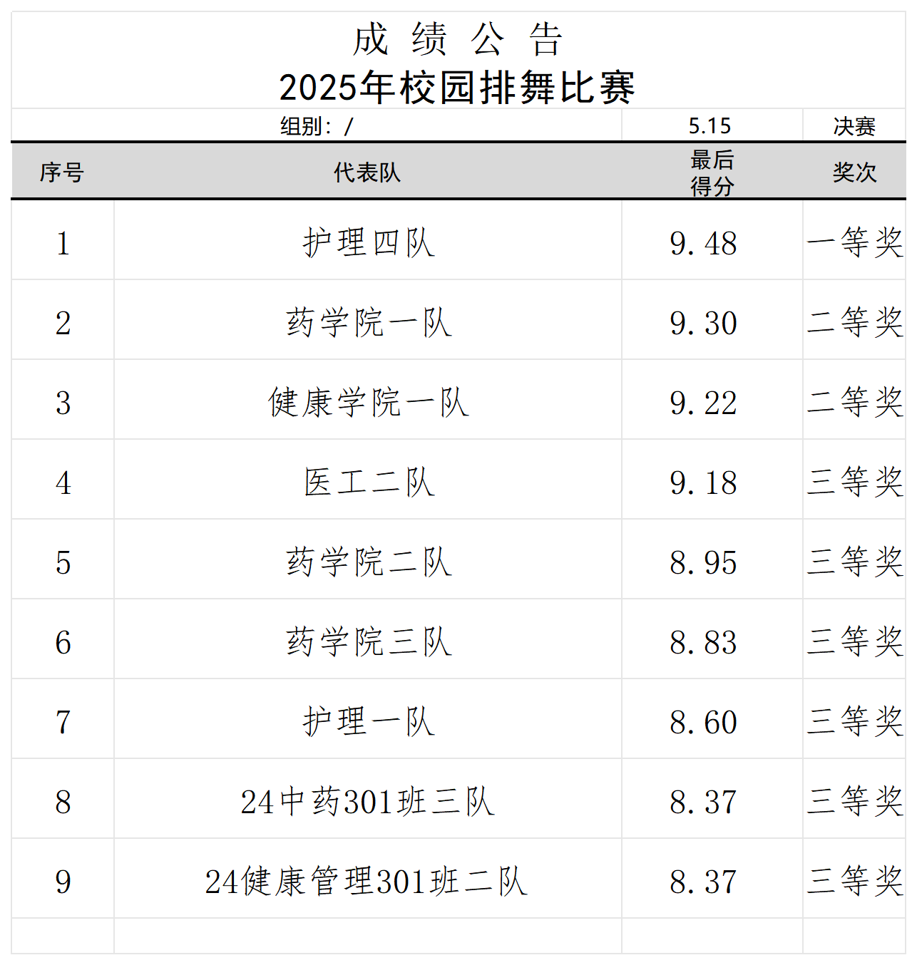 5月15日,2025年體育文化節(jié)校園排舞比賽暨排舞課程思政示范課程學習成果展示圓滿落幕。護理學院、藥學院、公共衛(wèi)生與健康管理學院、體育部相關(guān)負責人到場觀賽。