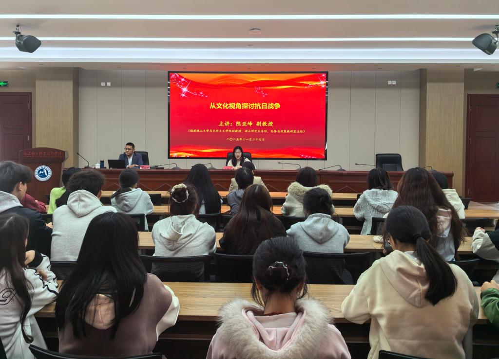 陳亞峰從“文化”這一獨特視角切入,為師生們系統(tǒng)梳理了抗日戰(zhàn)爭從災難到勝利的壯闊歷程,深刻揭露出日本軍國主義的侵略本質,勾勒出全民族抗戰(zhàn)形成的脈絡,客觀評價了正面戰(zhàn)場的作用,并以雄辯的史實和深刻的文化分析,有力論證了中國共產(chǎn)黨作為全民族抗戰(zhàn)中流砥柱的歷史必然性。陳亞峰強調,偉大抗戰(zhàn)精神是以愛國主義為核心的民族精神的重要體現(xiàn),也是中華文化在血與火的淬煉中迸發(fā)出的強大力量,我們必須用好福建本土紅色文化資源,賡續(xù)紅色血脈,共繪傳承新篇章。