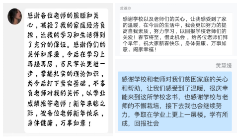 慰問結(jié)束后,同學(xué)們紛紛發(fā)來感謝短信,感激國家資助政策的支持,感謝學(xué)校和老師的溫暖關(guān)懷,表示未來將再接再厲、踔厲奮發(fā)、學(xué)有所成,報答學(xué)校和老師的殷切栽培,并向老師們送上了新春祝福。