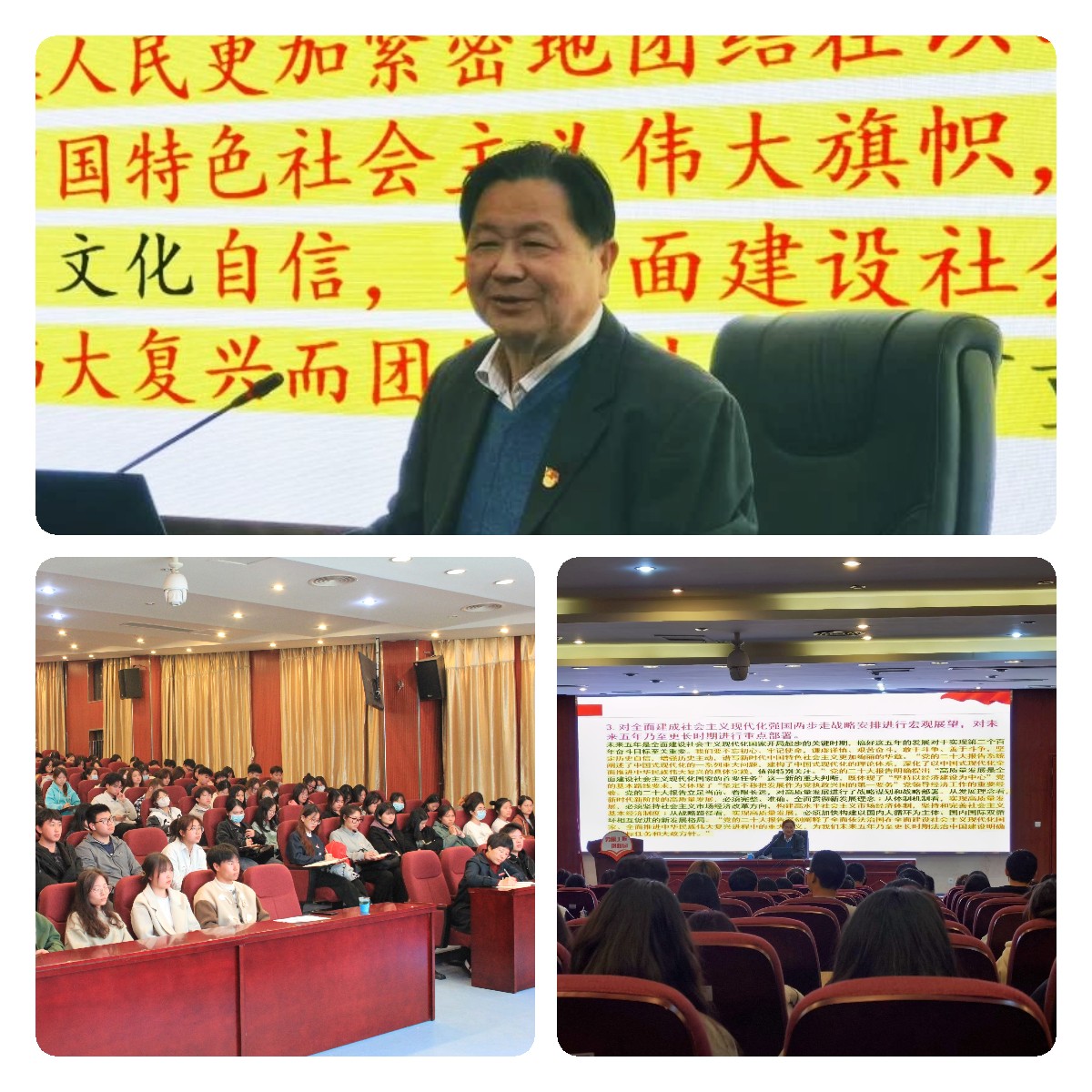 黃旺生教授對(duì)黨的二十大的召開(kāi)情況、重要意義、主要精神作了全面闡釋?zhuān)⒅攸c(diǎn)對(duì)如何學(xué)習(xí)宣傳貫徹落實(shí)黨的二十大精神,提出思考和針對(duì)性指導(dǎo)建議。他勉勵(lì)師生要從六個(gè)方面入手,自覺(jué)做黨的二十大精神的堅(jiān)定信仰者、有力傳播者、忠實(shí)踐行者:一是在深入學(xué)習(xí)、深刻領(lǐng)會(huì)上下功夫,用黨的二十大精神武裝頭腦、固根守魂;二是認(rèn)真研讀黨的二十大報(bào)告和新黨章,著重把握重點(diǎn)內(nèi)容;三是抓住重點(diǎn),做到五個(gè)“牢牢把握”;四是在強(qiáng)化本領(lǐng)、提高能力上下功夫;五是理論聯(lián)系實(shí)際,用黨的二十大精神指導(dǎo)實(shí)踐、改進(jìn)提升工作;六是激發(fā)廣大入黨積極分子學(xué)習(xí)的積極性、主動(dòng)性。