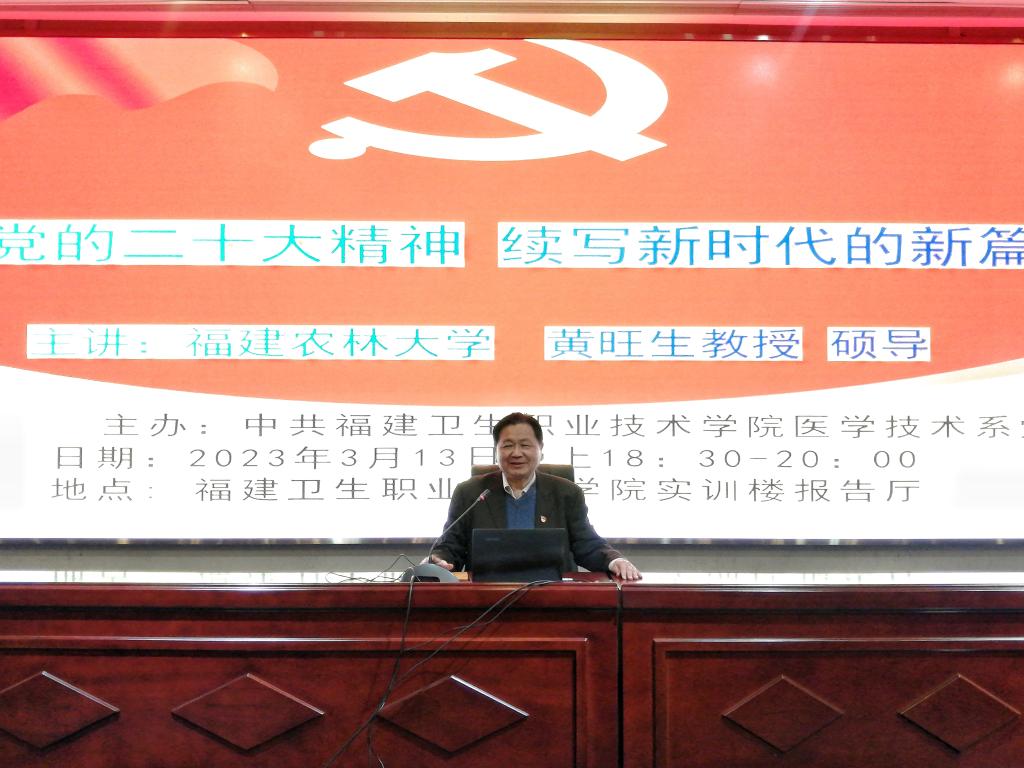 3月13日,福建農(nóng)林大學(xué)黃旺生教授來(lái)校為醫(yī)學(xué)技術(shù)系師生講授《學(xué)習(xí)黨的二十大精神 續(xù)寫(xiě)新時(shí)代的新篇章》黨課。醫(yī)學(xué)技術(shù)系黨總支書(shū)記柯瓊鶯、黨員教師代表及醫(yī)學(xué)技術(shù)系第二十一期業(yè)余分黨校暨青馬工程培訓(xùn)班學(xué)員150余人共同參加學(xué)習(xí)。
