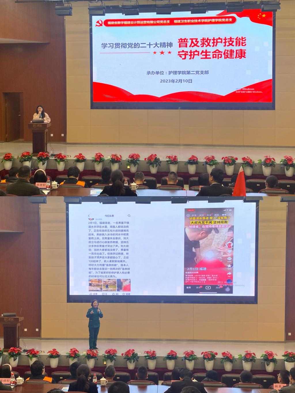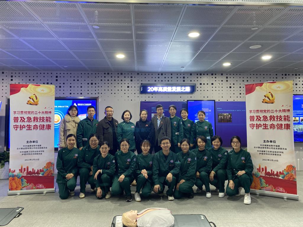 為進一步普及應(yīng)急救護常識,提高全民自救互救能力,樹立“人人學急救,急救為人人”的理念。2月10日,護理學院黨總支副書記、院長龔海蓉一行帶領(lǐng)第二黨支部全體黨員教師走進黨建共建單位數(shù)字福建云計算中心,開展“學習貫徹黨的二十大精神 普及急救技能 守護生命健康”的主題黨日活動,數(shù)字福建云計算中心董事長郭孔武、總經(jīng)理陳莉琳等120余名員工參加本次培訓。
