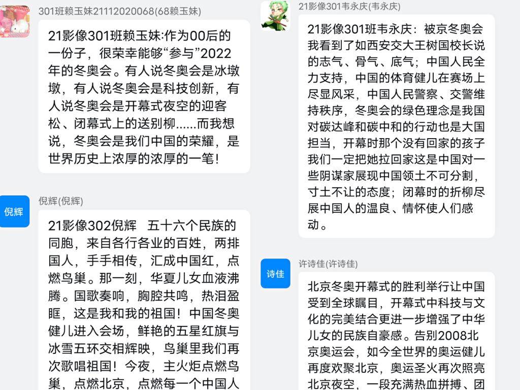 習(xí)近平新時(shí)代中國(guó)特色社會(huì)主義思想讀書社社長(zhǎng)、21嬰托301班葉鎵萍感慨:冬奧會(huì)帶來(lái)的“C位”視角,讓中國(guó)青年擁有了“平視世界”的民族自信,深切感悟到“兩個(gè)變局”下的人生際遇與時(shí)代責(zé)任。中國(guó)青年要向奧運(yùn)健兒學(xué)習(xí),彰顯“勇于擔(dān)當(dāng)”色彩,將青春“小我”融入祖國(guó)“大我”;中國(guó)青年要向冬奧志愿者學(xué)習(xí),彰顯“艱苦奮斗”色彩,以永不懈怠的奮斗姿態(tài)投入攀高峰、立事業(yè)的實(shí)踐磨礪。