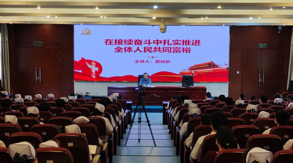 曾武祈以“在接續(xù)奮斗中扎實推進(jìn)共同富裕”為題,講述“時代三大件”“閩寧山海情”“三進(jìn)下黨鄉(xiāng)”等一個個難忘的脫貧故事,詳細(xì)介紹習(xí)近平總書記在福建任職期間,推動對口幫扶、促進(jìn)共同富裕重大工程及相關(guān)論述,透徹分析了共同富裕的科學(xué)內(nèi)涵、實踐途徑及未來征程。談到我校中職護(hù)理專業(yè)精準(zhǔn)技術(shù)扶貧委培班時,曾武祈向在場同學(xué)贈送由他主編的《教育點(diǎn)燃希望》書籍。他指出,我校始終與黨和國家同頻共振,堅定不移地在共同富裕背景下推動學(xué)校的高質(zhì)量發(fā)展,將凝聚青年力量作為立德樹人工作的重中之重。他號召閩衛(wèi)學(xué)子們潛精研思,做共同富裕思想的堅定學(xué)習(xí)者;矢志奮斗,做共同富裕的忠實踐行者。