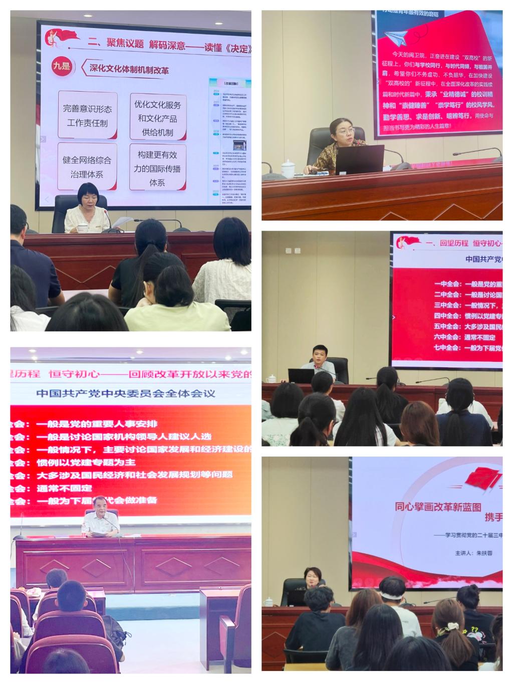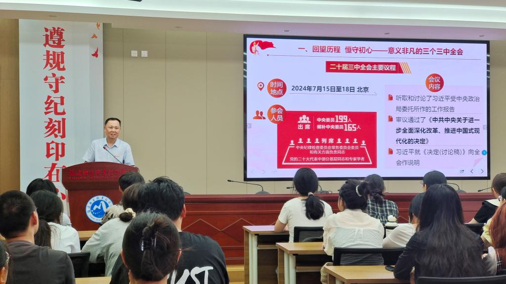 李美華、游鋒、黃銘珊、周雄、朱扶蓉圍繞深刻領(lǐng)悟黨的二十屆三中全會(huì)的重大意義、深入學(xué)習(xí)領(lǐng)會(huì)習(xí)近平總書(shū)記重要講話精神、全面準(zhǔn)確理解《決定》提出的進(jìn)一步全面深化改革重大舉措等方面進(jìn)行了系統(tǒng)闡釋和深入解讀。他們深情寄語(yǔ)廣大師生,今天的閩衛(wèi)院,正奮進(jìn)在建設(shè)“雙高?!钡男抡鞒躺?,諸君應(yīng)與學(xué)校同行,與時(shí)代同頻,與祖國(guó)并肩,應(yīng)不務(wù)虛功、不負(fù)韶華,在加快建設(shè)“雙高校的”新征程中,在全面深化改革的實(shí)踐續(xù)篇和時(shí)代新篇中,秉承“業(yè)精德誠(chéng)”的校訓(xùn)精神和“崇健臻善”“崇學(xué)篤行”的校風(fēng)學(xué)風(fēng),勤學(xué)善思、求是創(chuàng)新、明辨篤行,用使命與擔(dān)當(dāng)書(shū)寫(xiě)更為精彩的人生篇章。