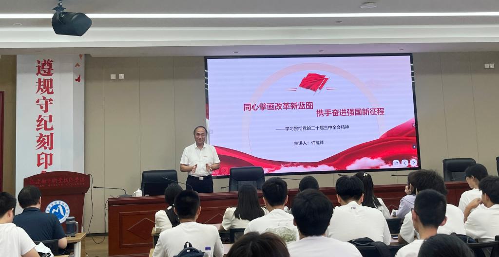 曾武祈聚焦“同心擘畫(huà)改革新藍(lán)圖 攜手奮進(jìn)強(qiáng)國(guó)新征程”主題,圍繞習(xí)近平總書(shū)記在黨的二十屆三中全會(huì)上的重要講話和全會(huì)通過(guò)的《決定》,對(duì)全會(huì)的重大意義、《決定》提出的重大改革創(chuàng)新舉措和習(xí)近平總書(shū)記關(guān)于全面深化改革的一系列新思想、新觀點(diǎn)、新論斷,進(jìn)行了重點(diǎn)解讀和細(xì)致梳理。他指出,全會(huì)精神是一座理論“富礦”,學(xué)習(xí)領(lǐng)會(huì)也必須持續(xù)發(fā)力、久久為功。閩衛(wèi)院師生應(yīng)堅(jiān)持在深化內(nèi)化轉(zhuǎn)化上下功夫,學(xué)深悟透、以學(xué)促行,爭(zhēng)做黨的二十屆三中全會(huì)精神的踐行者,助推全會(huì)精神落地生根、開(kāi)花結(jié)果。