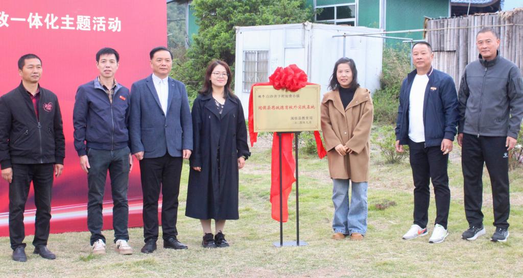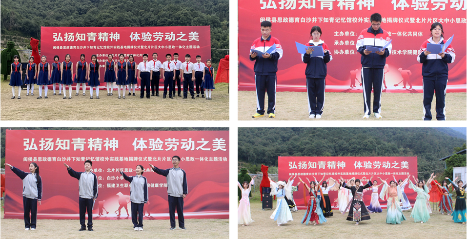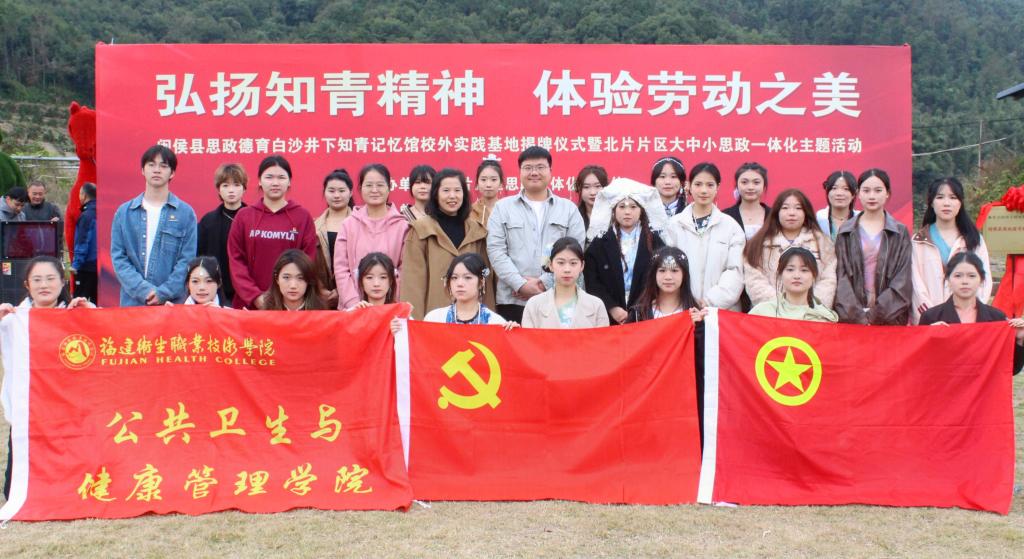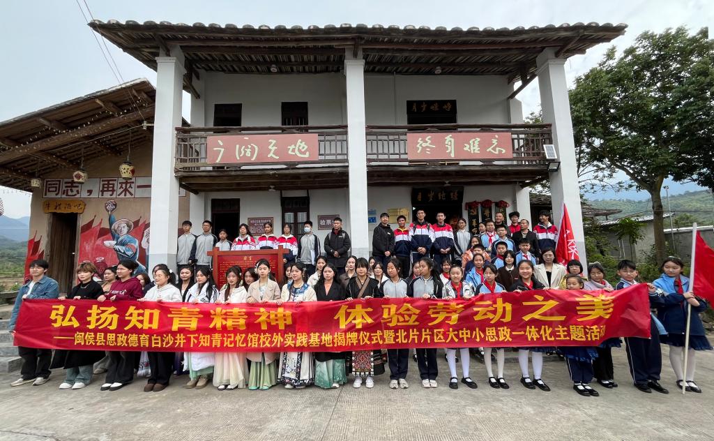 閩侯縣教育局、白沙鎮(zhèn)、井下村、閩侯四中、白沙中學(xué)、白沙學(xué)區(qū)領(lǐng)導(dǎo)以及健康學(xué)院師生代表共同為白沙井下知青記憶館校外思政教育基地揭牌。
