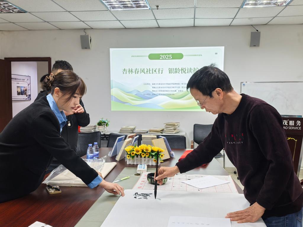 文化互動環(huán)節(jié)同樣精彩紛呈。來自社區(qū)的老年書法家蕭惠敬揮毫潑墨,題字“濱城閩衛(wèi)共建健康,校社攜手同創(chuàng)福祉”展現(xiàn)了傳統(tǒng)文化的魅力。隨后,師生們與社區(qū)居民們共讀圖書,分享閱讀心得,發(fā)表生活感悟,營造了濃厚的文化氛圍。