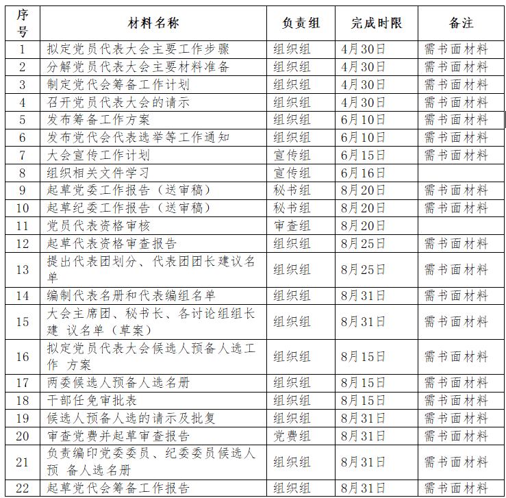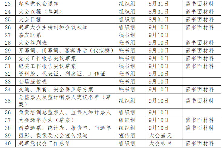 主要任務(wù):起草召開(kāi)黨員代表大會(huì)的請(qǐng)示、報(bào)告、通知;組織指導(dǎo)代表的選舉工作,匯總代表名單,提出列席人員、邀請(qǐng)人員名單;編制代表名冊(cè)和代表編組名單;提出大會(huì)主席團(tuán)、秘書(shū)長(zhǎng)建議名單,以及大會(huì)執(zhí)行主席的分組建議名單;組織黨委委員和紀(jì)委委員候選人預(yù)備人選的醞釀、民主推薦和考察工作,起草候選人的基本情況介紹;起草選舉辦法和填寫(xiě)選票注意事項(xiàng)的說(shuō)明,印制選票;安排大會(huì)日程,負(fù)責(zé)統(tǒng)計(jì)每天到會(huì)人數(shù);起草大會(huì)各種會(huì)議的主持詞;培訓(xùn)總監(jiān)票人、監(jiān)票人和計(jì)票人;做好黨委、紀(jì)委第一次全體會(huì)議選舉的準(zhǔn)備和組織工作;負(fù)責(zé)上述文件的打印、校對(duì)、裝訂及分發(fā)。