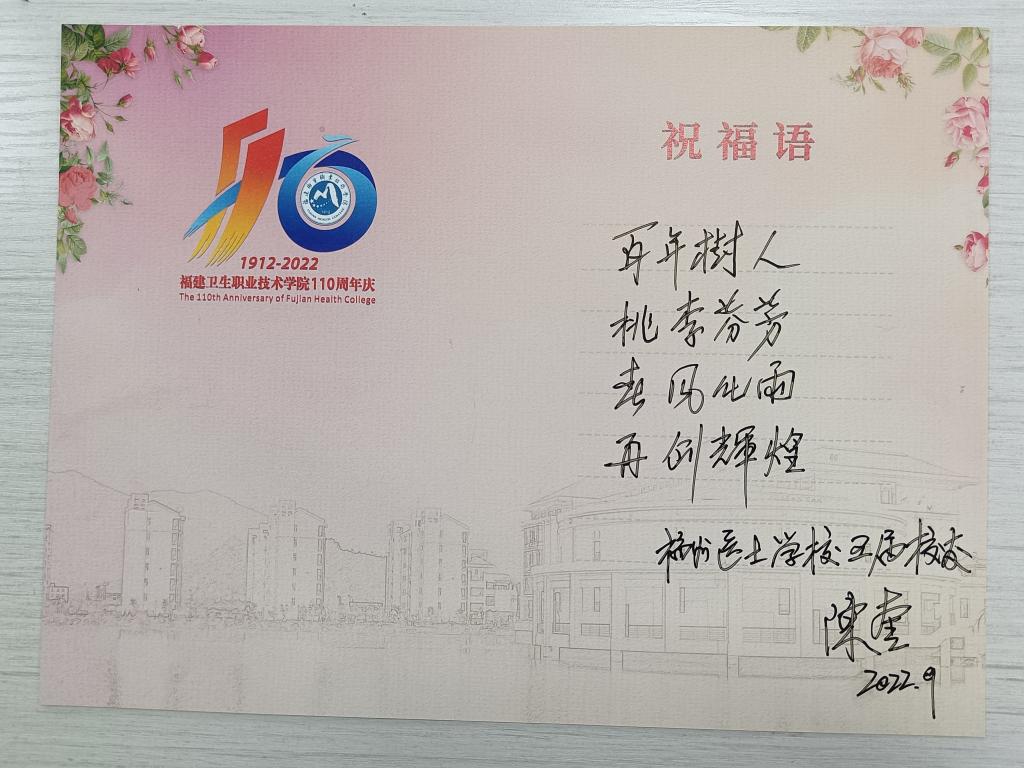 臨別之際,陳奎校友向?qū)W校一行贈送了他親自牽頭編著的《0-3歲兒童早期發(fā)展指導(dǎo)——育兒寶典》,并手書母校110周年校慶祝福語:百年樹人,桃李芬芳。春風(fēng)化雨,再創(chuàng)輝煌!