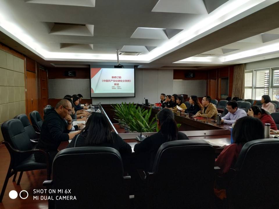 為深入貫徹落實(shí)習(xí)近平新時代中國特色社會主義思想,進(jìn)一步強(qiáng)化黨的紀(jì)律,統(tǒng)一思想,形成共識, 11月27日下午,學(xué)院紀(jì)委在行政樓四樓會議室舉辦新修訂的《中國共產(chǎn)黨紀(jì)律處分條例》解讀講座,由紀(jì)委書記李美華進(jìn)行解讀。紀(jì)委委員、黨總支、黨支部紀(jì)檢委員和紀(jì)檢監(jiān)察室全體工作人員參加了講座。講座由紀(jì)委副書記程劍芬主持。