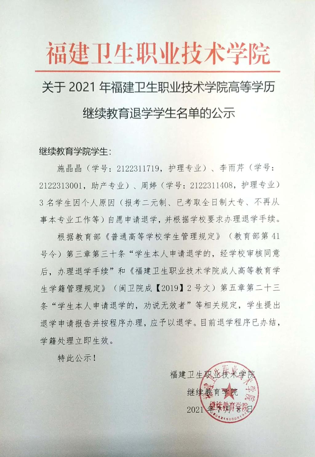 關(guān)于2021年福建衛(wèi)生職業(yè)技術(shù)學院高等學歷繼續(xù)教育施晶晶等3名退學學生名單的公示
