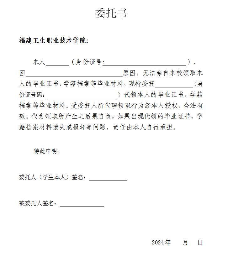 請學生本人攜帶身份證原件在規(guī)定時間到校領取畢業(yè)證及檔案。若是本人因特殊情況無法到校領取需委托親屬代領的,代領時請攜帶委托書、委托人和被委托人的身份證原件和復印件(委托書和復印件提交留存)。