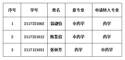 根據(jù)中國(guó)藥科大學(xué)繼續(xù)教育學(xué)院相關(guān)管理規(guī)定,2021級(jí)翁淑怡等3人因個(gè)人工作需要等原因,提出轉(zhuǎn)專業(yè)申請(qǐng),經(jīng)班主任審核,我站研究審議,該3名學(xué)生符合轉(zhuǎn)專業(yè)條件,同意轉(zhuǎn)專業(yè),并上報(bào)中國(guó)藥科大學(xué)繼續(xù)教育學(xué)院審批。