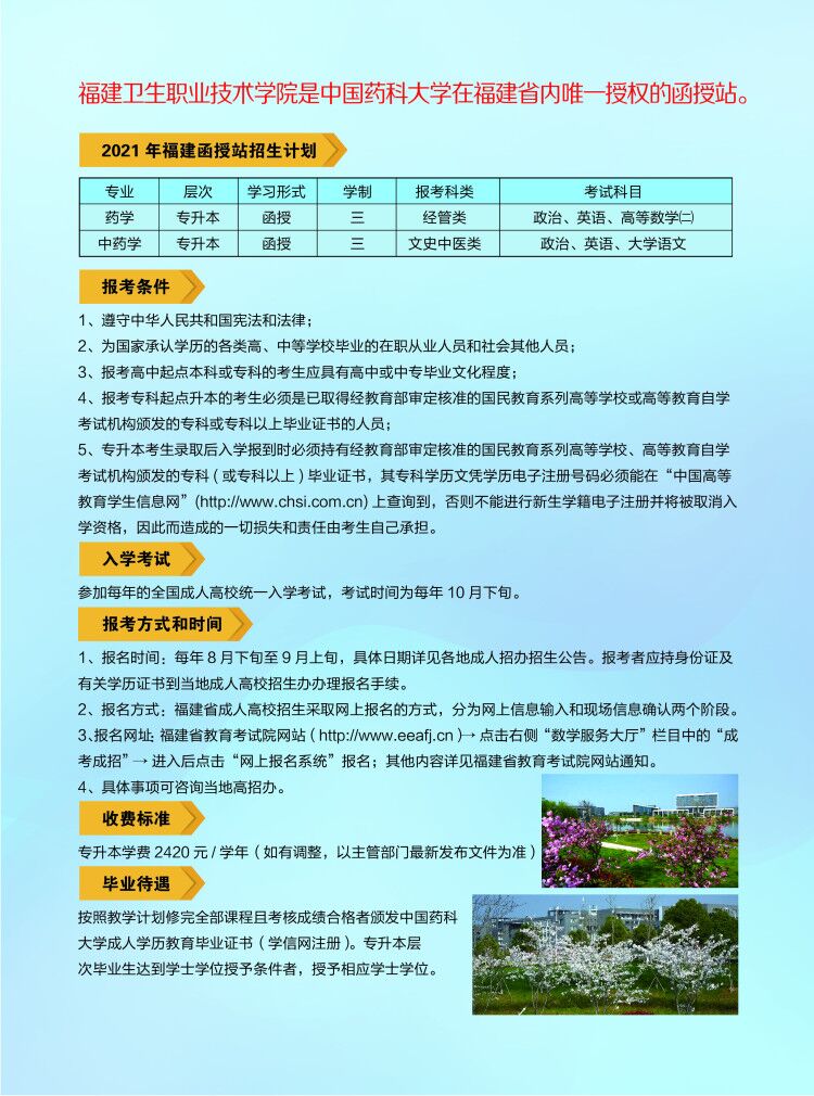 2021年中國藥科大學(xué)高等學(xué)歷繼續(xù)教育福建函授站招生簡章