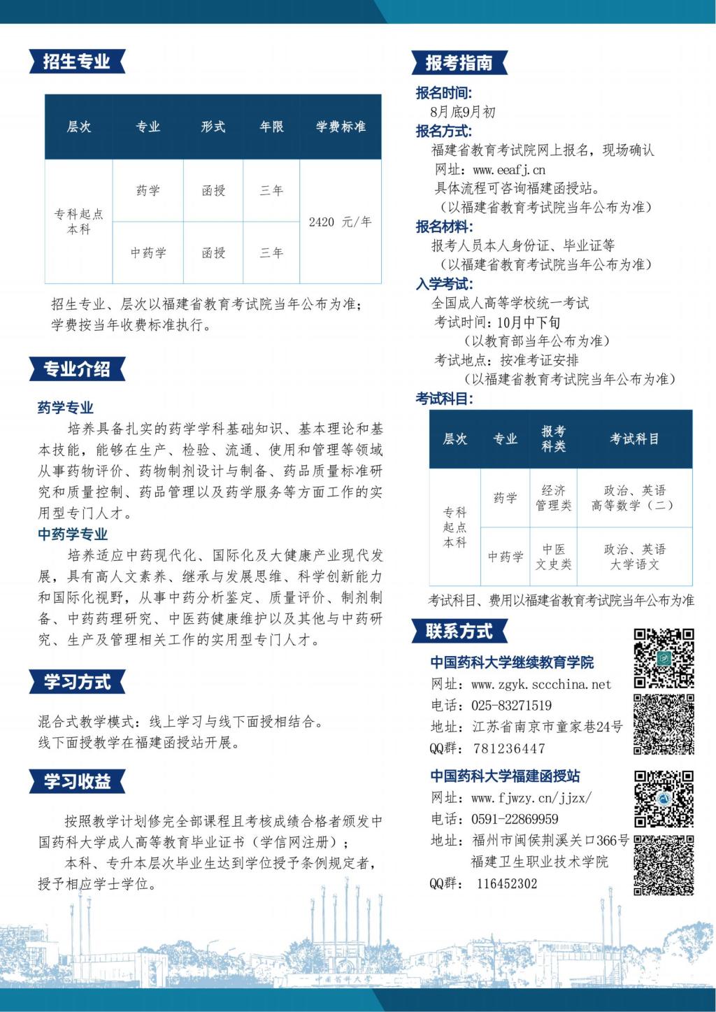 2023年中國藥科大學(xué)高等學(xué)歷繼續(xù)教育福建函授站招生簡章