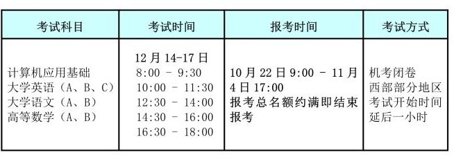 (1)《計(jì)算機(jī)應(yīng)用基礎(chǔ)》、《大學(xué)英語(yǔ)》B兩門(mén)統(tǒng)考課程全部采用混編考場(chǎng)方式。報(bào)考時(shí)間如下: