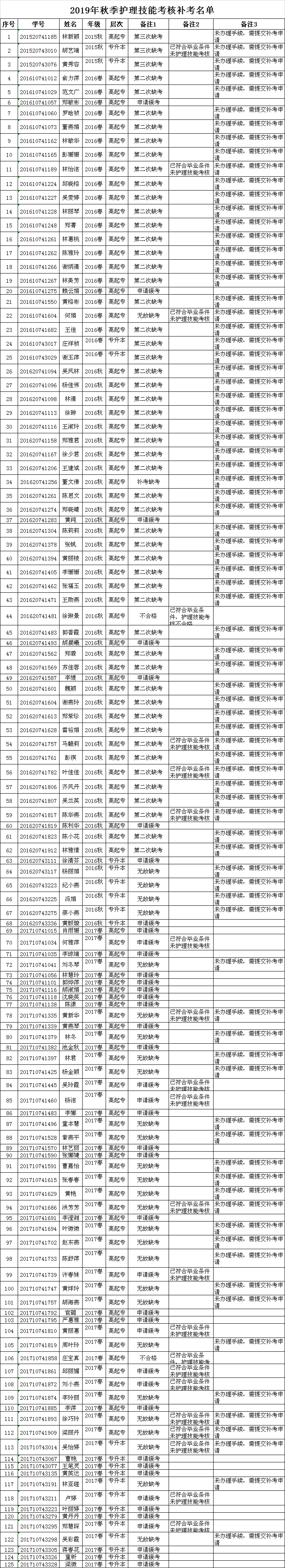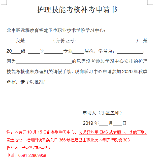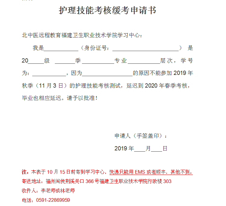 3.請各位學(xué)生做好調(diào)班請假手續(xù)(緩考申請詳見附件3)。若有特殊情況(如懷孕、坐月子、生病等)不能參加護理技能測試的,請于10月15日前向?qū)W習(xí)中心提交書面緩考申請延遲到2020年春季測試,畢業(yè)時間相應(yīng)延遲。為有效利用考試資源,之前無故缺考的考生需提前提交補考申請方可參加本次考核(補考申請詳見附件4)。