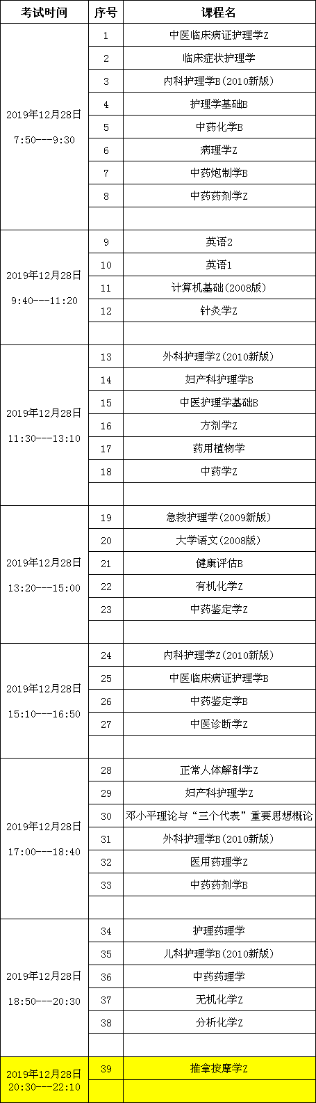 2019年12月28日考試安排