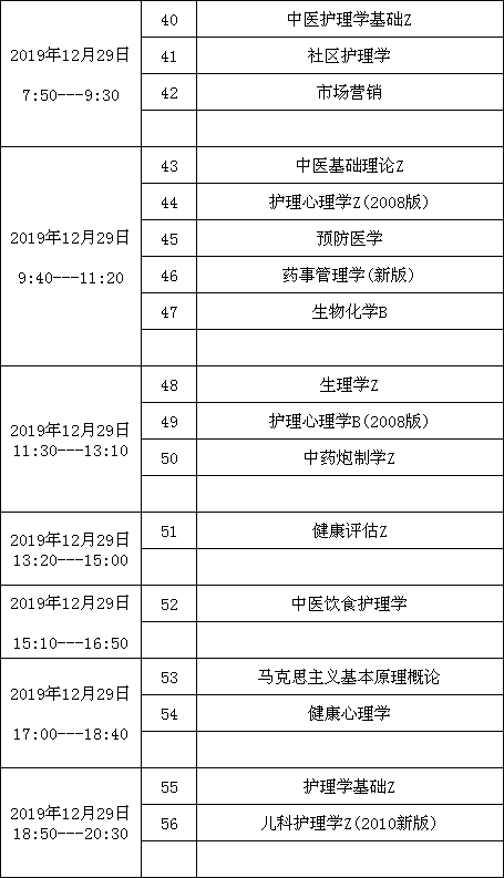 2019年12月29日考試安排