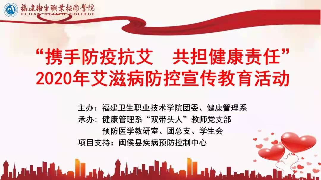 2020年11月12日,在第33個“世界艾滋病日”來臨之際,為進一步宣傳普及艾滋病防治知識,由校團委、健康管理系主辦的“攜手防疫抗艾,共擔(dān)健康責(zé)任”防艾宣傳教育活動啟動儀式在實訓(xùn)樓報告廳舉行,院長許能鋒、副院長黃銘珊、福建省疾控中心副主任醫(yī)師夏品蒼、閩侯縣疾控中心副主任陳曉燕出席,校團委、學(xué)工部、各二級院系黨團總支負(fù)責(zé)人、師生代表700多名在主會場和5個分會場參加活動。