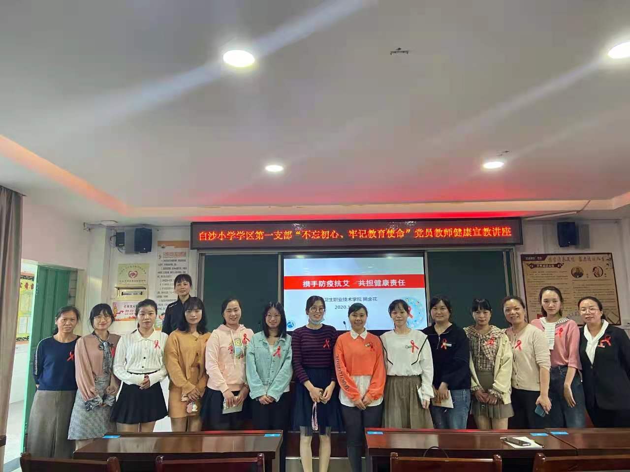 在2020年職業(yè)教育活動(dòng)周來(lái)臨之際,為發(fā)揮職業(yè)教育服務(wù)社會(huì)職能,福建衛(wèi)生職業(yè)技術(shù)學(xué)院健康管理系黨總支副書(shū)記吳燕玲帶領(lǐng)“雙帶頭人”教師黨支部師生黨員、青年團(tuán)員來(lái)到白沙中心小學(xué),以志愿者身份開(kāi)展以“攜手防疫抗艾 共建健康中國(guó)”為主題的健康教育課,白沙小學(xué)學(xué)區(qū)6所學(xué)校老師、家長(zhǎng)代表、小學(xué)生等500余人參加。