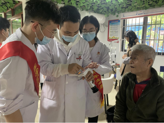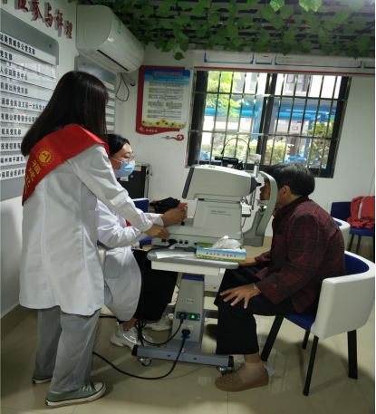 眼部疾病檢查,愛眼護眼在行動。眼視光技術專業(yè)的師生攜帶裂隙燈顯微鏡、非接觸性眼壓計、眼底照相機等專業(yè)設備,為社區(qū)居民開展眼部健康、眼前節(jié)及眼底等檢查,篩查年齡相關性白內障和糖尿病視網膜病變。對義診中篩查出的眼部健康問題,師生們耐心指導社區(qū)居民愛眼護眼的方法,引導特殊情況及時就醫(yī)。