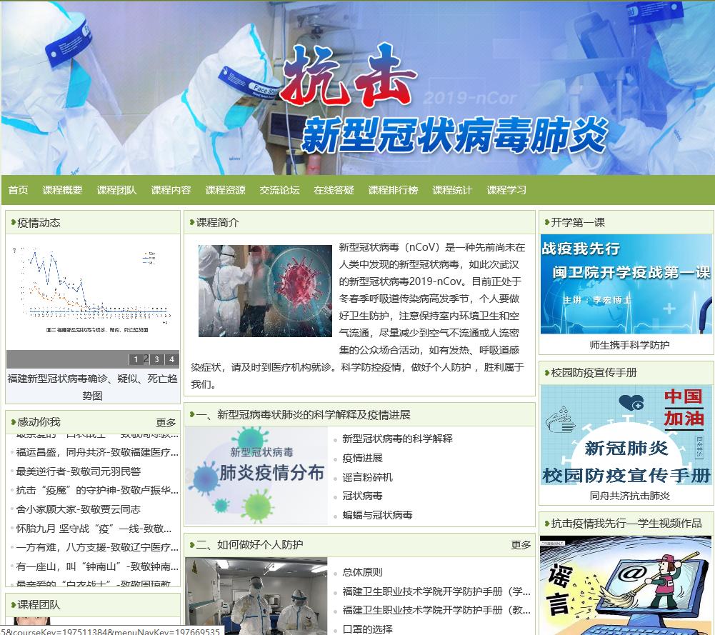 為貫徹落實教育部“課程學習與疫情防控知識學習相結合,特別注重疫情防護知識普及,加強生命教育、公共安全教育和心理健康教育”工作指示,福建衛(wèi)生職業(yè)技術學院管理系黨總支第一黨支部教師黨員聯(lián)合預防醫(yī)學教研室,利用預防醫(yī)學專業(yè)優(yōu)勢,面向校內(nèi)學生,在學院“天使之城”學習空間開設《抗擊新型冠狀病毒肺炎》網(wǎng)絡課程。