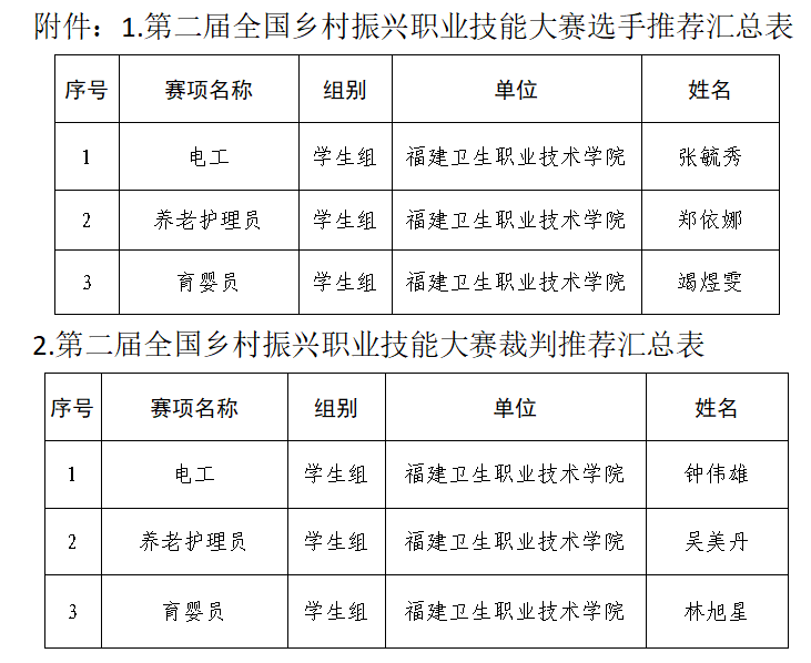 根據(jù)《福建省人力資源和社會保障廳關(guān)于做好第二屆全國鄉(xiāng)村振興職業(yè)技能大賽參賽報名工作的通知》要求,經(jīng)二級學(xué)院推薦,繼續(xù)教育學(xué)院審核,擬推薦以下學(xué)生和老師報名第二屆全國鄉(xiāng)村振興職業(yè)技能大賽參賽選手和裁判員。
