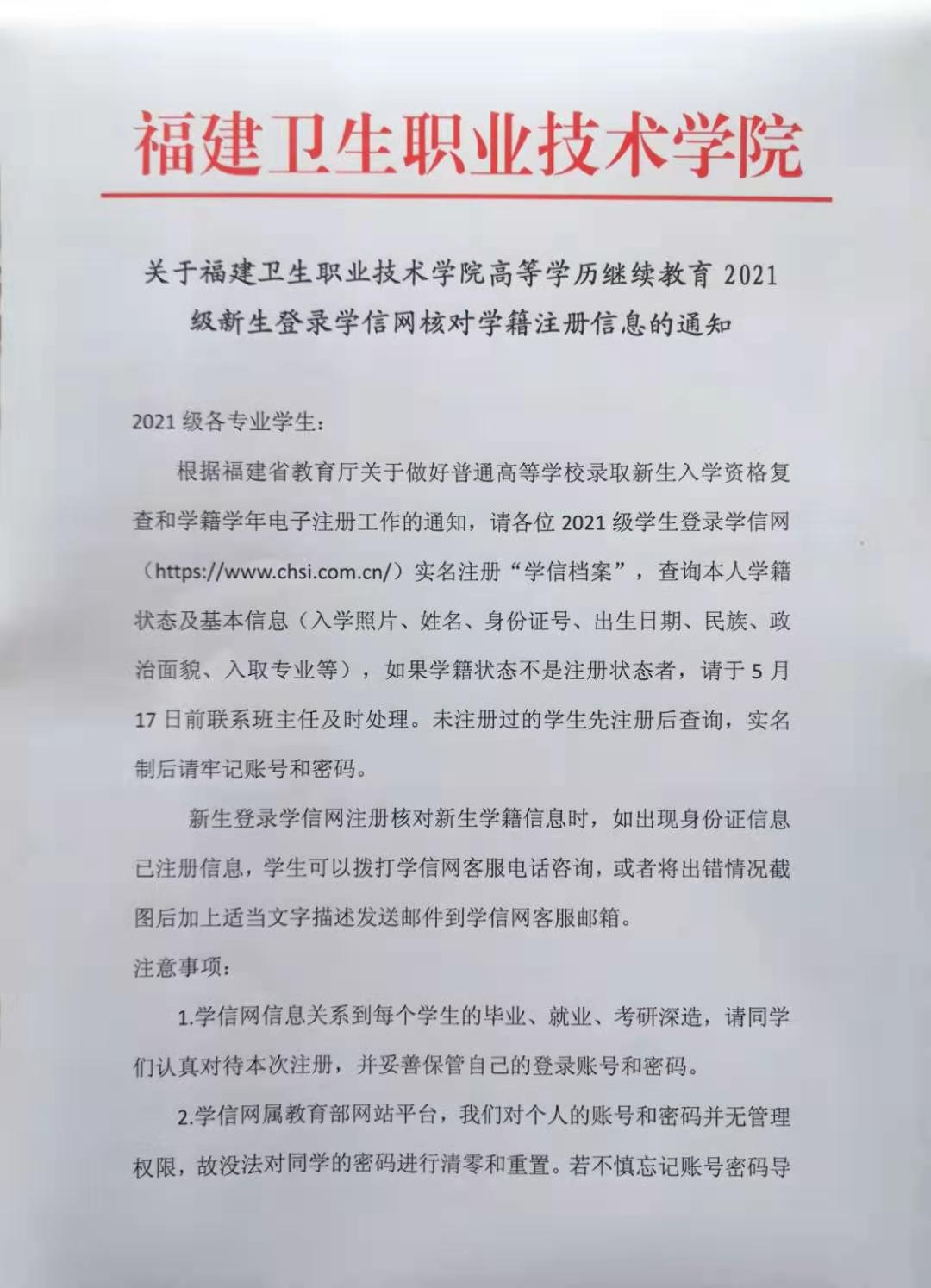 關于福建衛(wèi)生職業(yè)技術學院高等學歷繼續(xù)教育2021級新生登錄學信網核對學籍注冊信息的通知