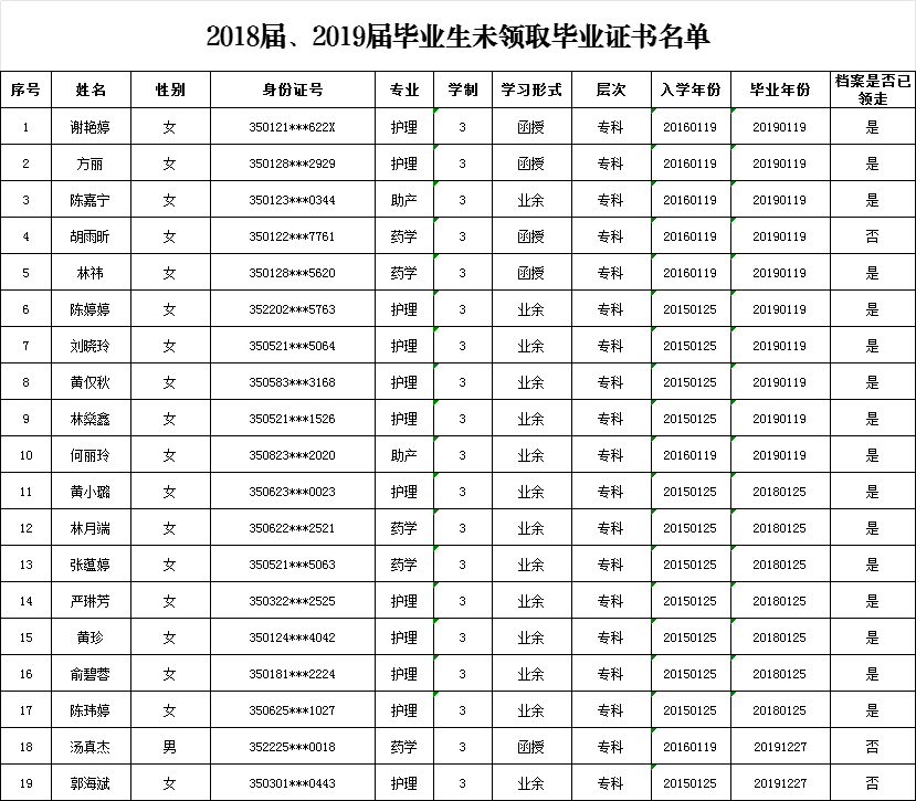 關(guān)于催促福建衛(wèi)生職業(yè)技術(shù)學(xué)院高等學(xué)歷繼續(xù)教育2018屆、2019屆畢業(yè)生領(lǐng)取畢業(yè)證書的通知