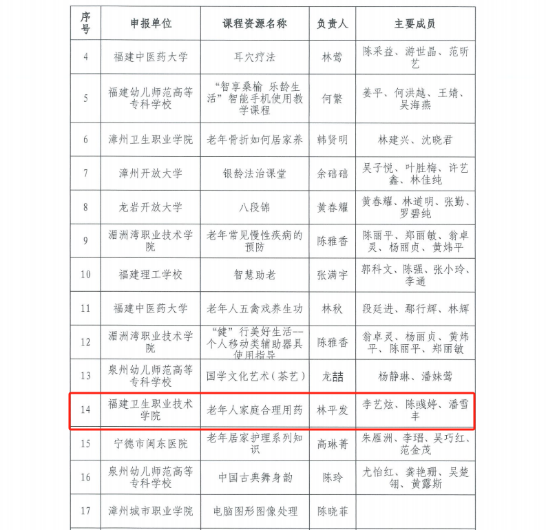 近日,福建省教育廳公布2024年省級“智慧助老”優(yōu)質(zhì)工作案例和課程資源推介名單,我校藥學(xué)院林平發(fā)老師負(fù)責(zé)的《老年人家庭合理用藥》入選優(yōu)質(zhì)課程資源。