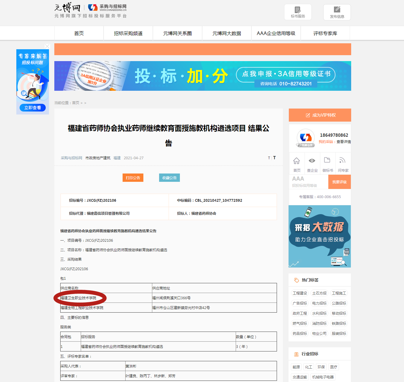 近日,福建省藥師協(xié)會執(zhí)業(yè)藥師繼續(xù)教育面授施教機構(gòu)遴選項目結(jié)果公告,我校憑借突出的辦學條件、雄厚的教學實力以及良好的市場信譽,得到福建省藥師協(xié)會和評標專家的認可,在眾多競爭對手中脫穎而出,以評分第一的成績中標福建省藥師協(xié)會執(zhí)業(yè)藥師繼續(xù)教育面授施教機構(gòu)。這是我校首次以投標人的身份參與行業(yè)培訓機構(gòu)項目遴選。此次項目中標給我校今后參與行業(yè)培訓項目遴選積累了寶貴的經(jīng)驗。