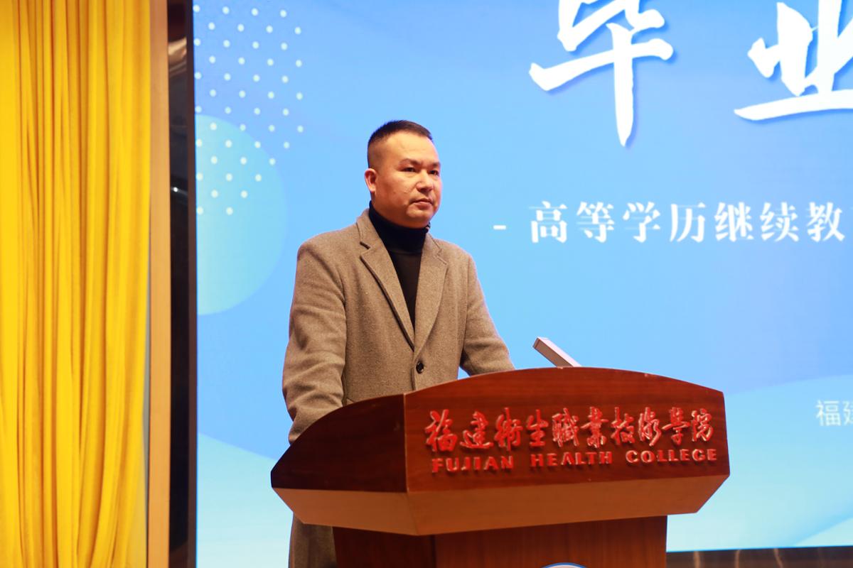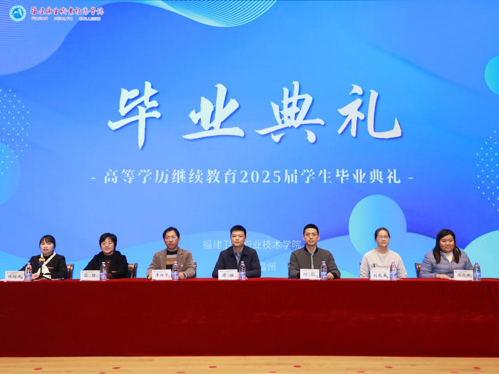 12月27日,我校隆重舉行高等學(xué)歷繼續(xù)教育2025屆學(xué)生畢業(yè)典禮。副校長(zhǎng)周雄,繼續(xù)教育學(xué)院、護(hù)理學(xué)院、藥學(xué)院、醫(yī)學(xué)院、醫(yī)學(xué)技術(shù)與工程學(xué)院相關(guān)領(lǐng)導(dǎo)老師,畢業(yè)班班主任以及部分2025屆畢業(yè)生參加,1100多名外地畢業(yè)生收看線上直播。畢業(yè)典禮由繼續(xù)教育學(xué)院副院長(zhǎng)林麗鳳主持。