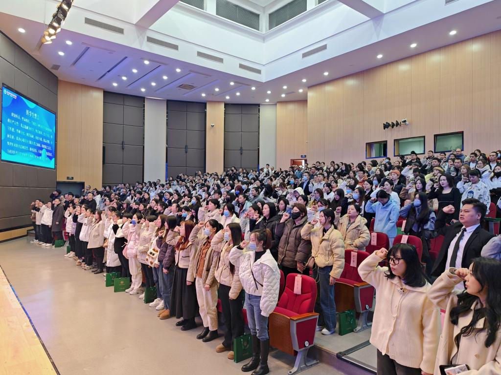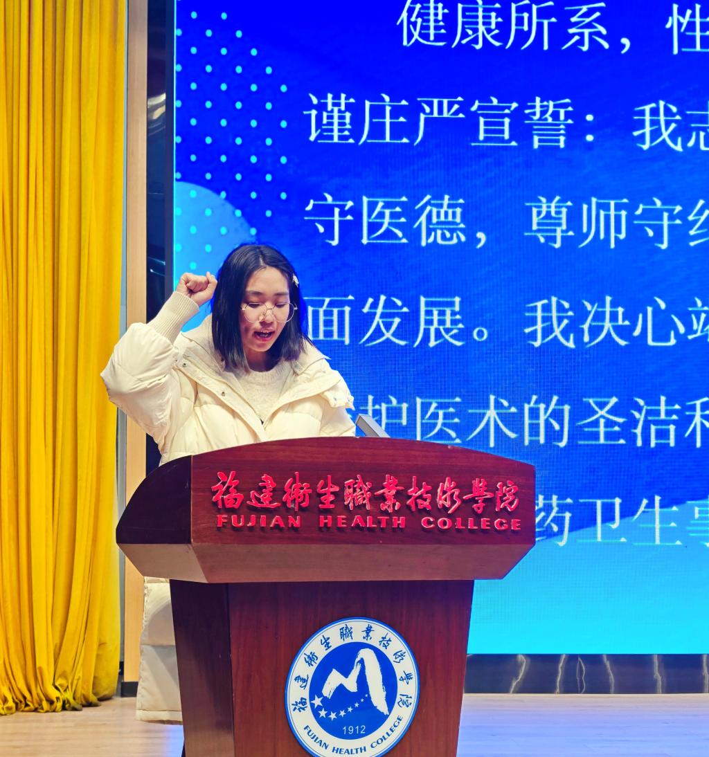 典禮上,2022級(jí)護(hù)理4班饒柳芳同學(xué)帶領(lǐng)全體畢業(yè)生重溫醫(yī)學(xué)生誓詞。拳頭緊握,誓言鏗鏘,表達(dá)了學(xué)子們不忘初心、踐行新時(shí)代醫(yī)藥衛(wèi)生職業(yè)精神的承諾。