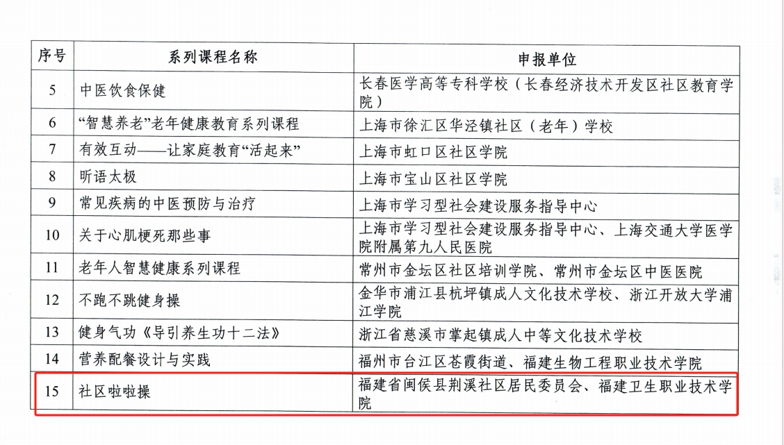 近日,教育部辦公廳公布2024年縣域社區(qū)學(xué)習(xí)中心典型案例和品牌課程推介名單。由我校體育部余照鋮老師主講,與閩侯縣荊溪社區(qū)居民委員會聯(lián)合申報的《社區(qū)啦啦操》課程,憑借創(chuàng)新的課程設(shè)計與顯著的社會效益脫穎而出,成功入選“2024年縣域社區(qū)學(xué)習(xí)中心品牌課程”。這不僅彰顯了我校在社區(qū)教育領(lǐng)域的積極探索與實踐成果,也展現(xiàn)了教師團(tuán)隊深耕基層教育的專業(yè)實力。