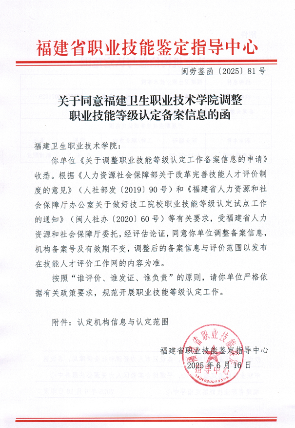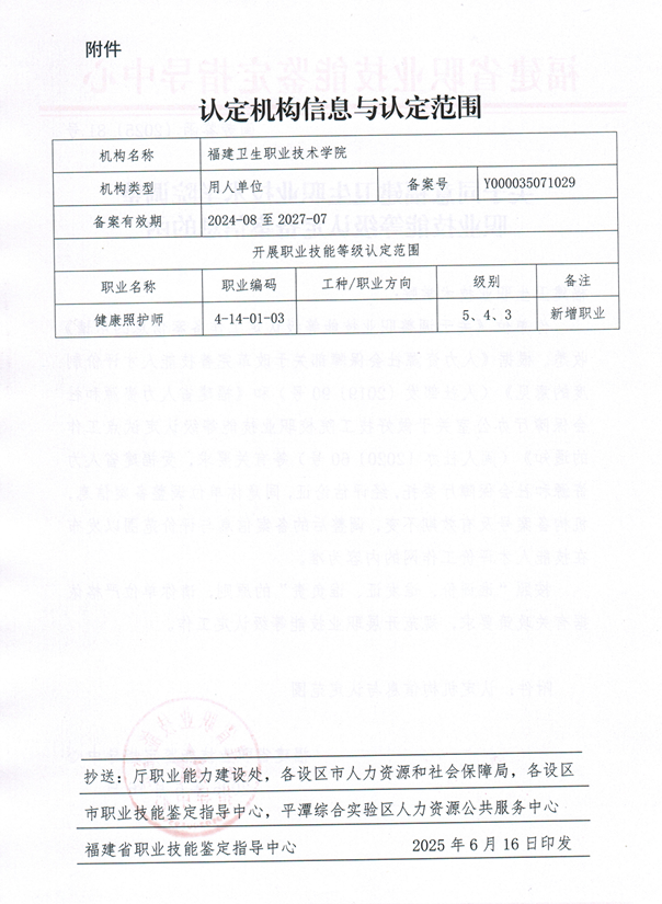 近日,我校成功通過福建省職業(yè)技能鑒定指導(dǎo)中心的嚴格審核并獲批備案,正式新增“健康照護師”職業(yè)技能等級認定資質(zhì)。標(biāo)志著我校在職業(yè)技能人才培養(yǎng)領(lǐng)域邁出了重要一步,今后可向本校相關(guān)專業(yè)學(xué)生提供專業(yè)的健康照護師技能等級評價服務(wù)。